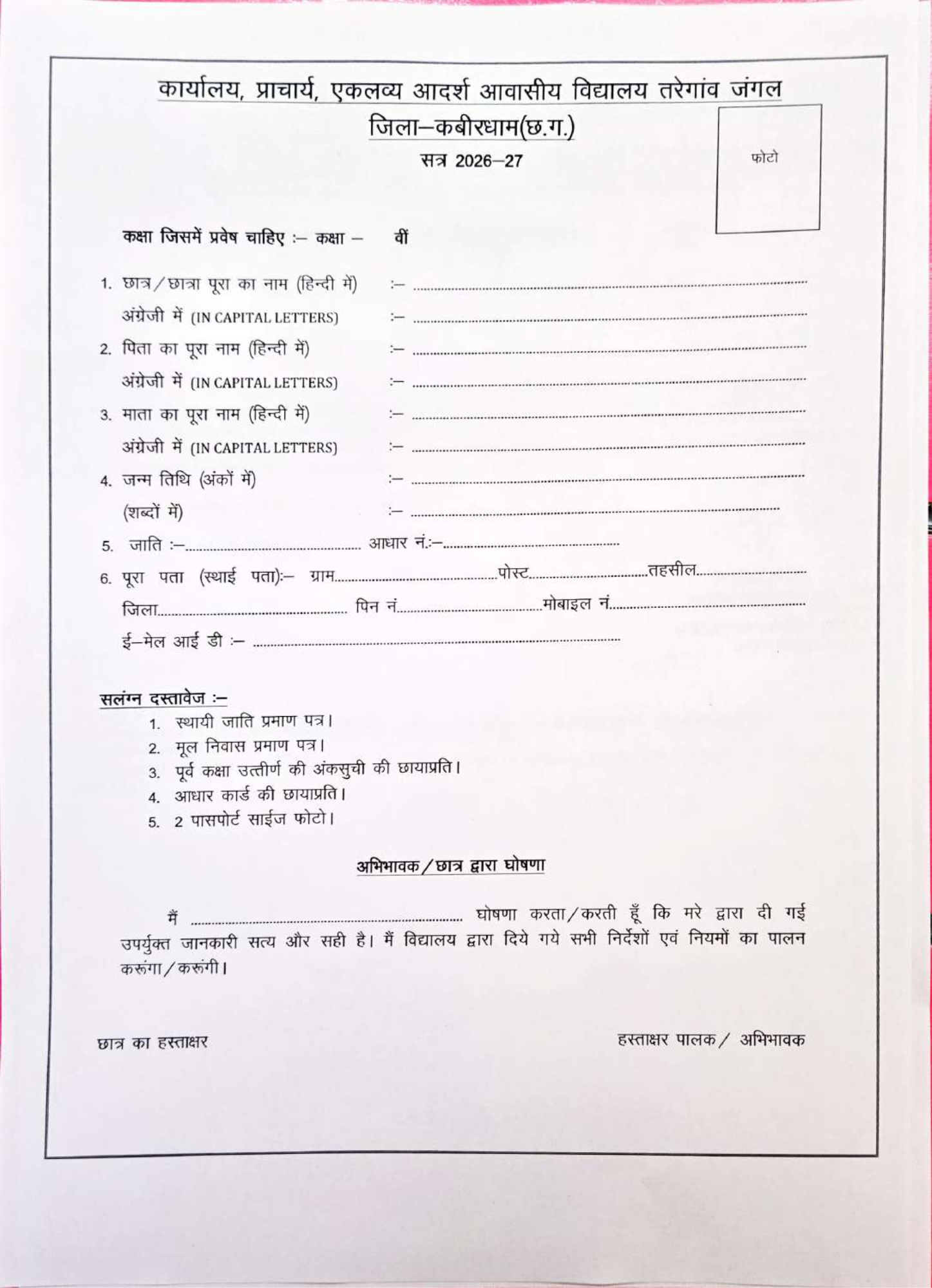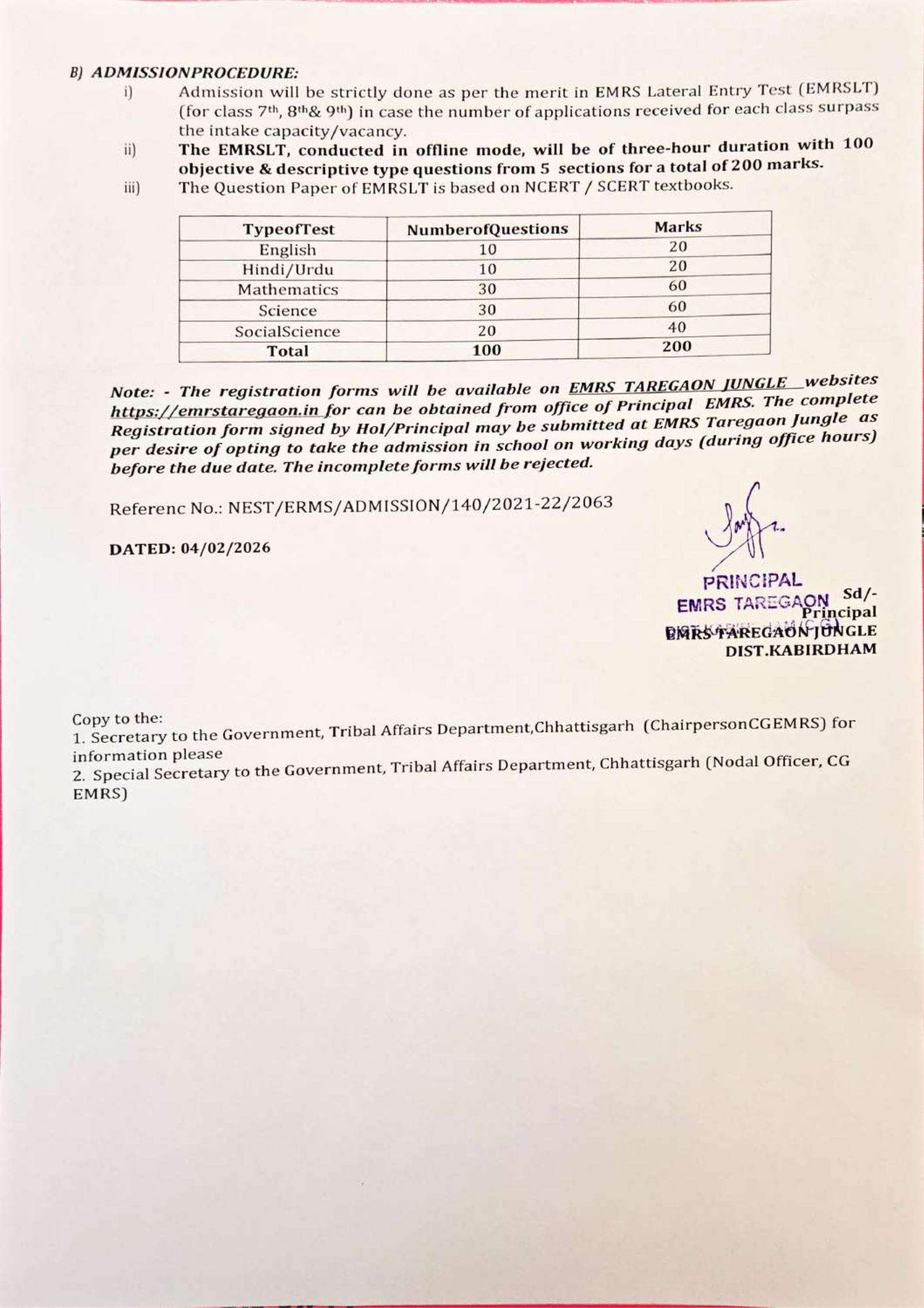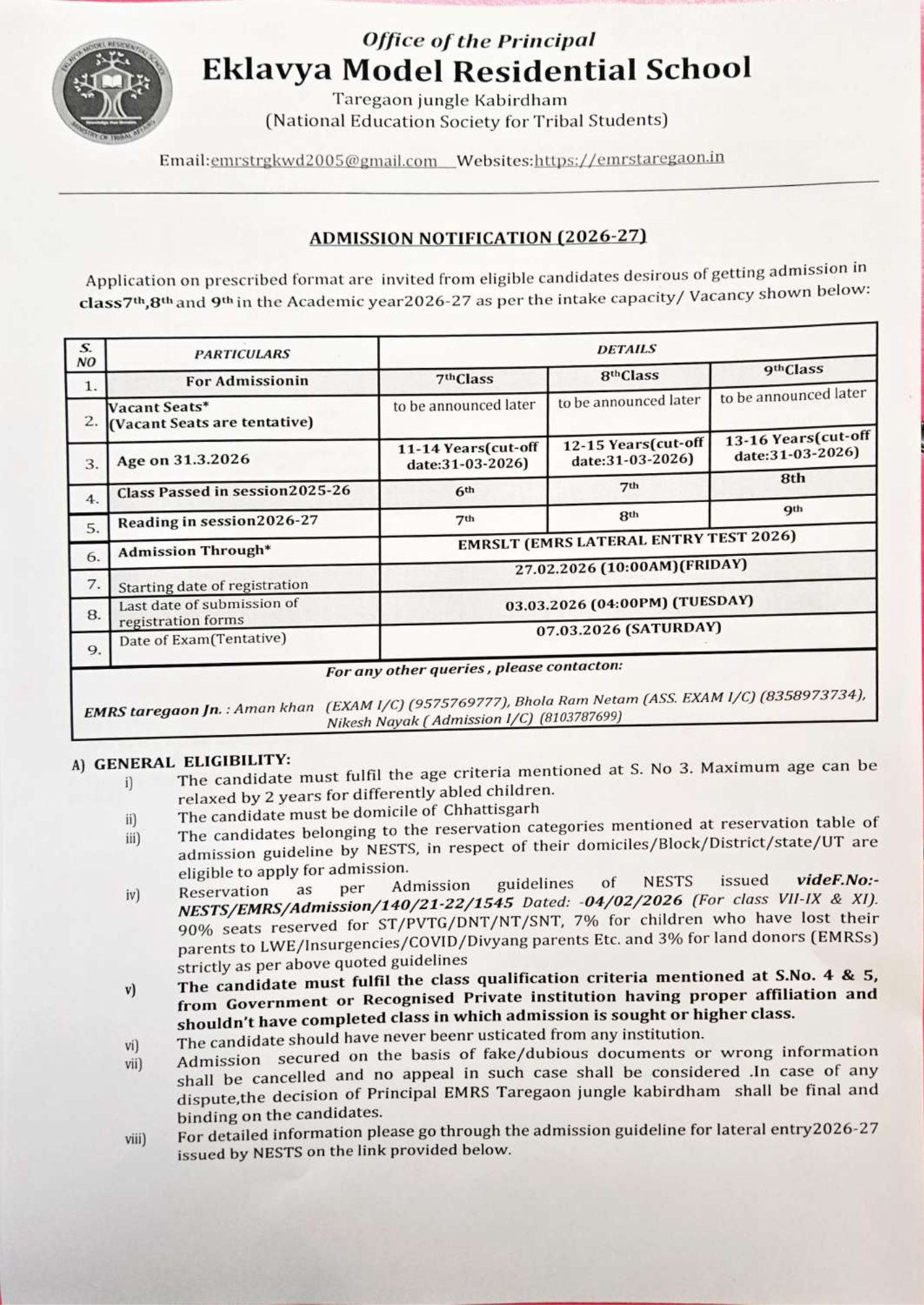 एकलव्य आदर्श आवासीय विद्यालय तरेगांव जंगल में कक्षा 7वीं, 8वीं और 9वीं में लेटरल एंट्री से प्रवेश के लिए आवेदन 27 फरवरी 2026 से प्रारंभ हो चुके हैं। प्रवेश परीक्षा 7 मार्च 2026 को विद्यालय में आयोजित की जाएगी। अधिक जानकारी के लिए विद्यालय की वेबसाइट emrstaregaon.in पर विजिट करें।